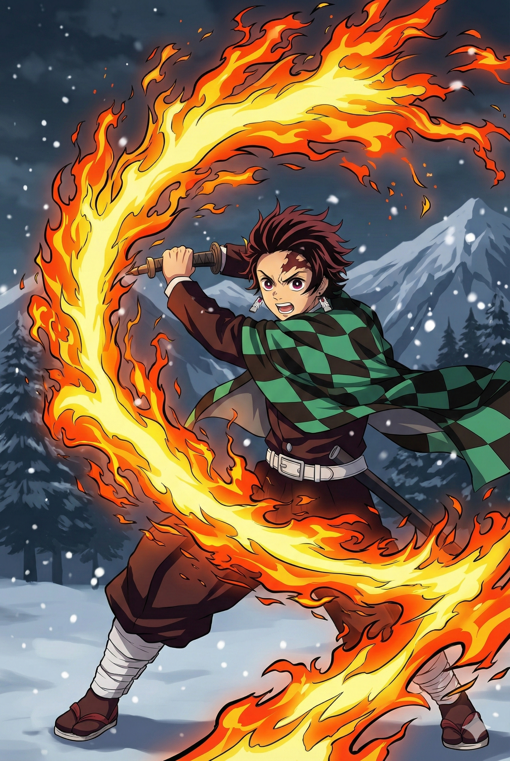Witness the intensity of flame and resolve of Tanjiro Kamado with this breathtaking anime canvas featuring a fiery sword arc against a snowy mountain backdrop. The dynamic motion, glowing flames, and heroic stance capture the spirit of determination and sacrifice of Tanjiro Kamado, turning an iconic anime moment into timeless wall art.